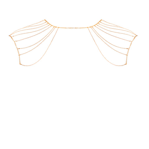 Small golden chains that stir the imagination both of the wearer and the beholder. An accessory that adds a sensual touch to your look, uncovers secret fantasies and awakens desire. Seduction is present in every little detail! Reversible. You choose how you want to wear the accessory you can tie it in front or in the back. Sensuality steps out! The perfect accessory for adding a sensual touch to your look. 100% adjustable! The chains of the chain shoulders and back jewellery are adjustable. Wear it with your evening outfit, lingerie or simply with your skin. Make a splash! Wear it with sexy lingerie and nipple pasties. Exclusive design by Bijoux Indiscrets. Design inspired by the sensuous dancers in New York cabarets, where seduction is present in every detail. Play without fear! There is no nickel in them so they will not cause any allergic reactions. The appearance of our jewellery is deceiving turn them into the instruments you need to get started in soft bondage.