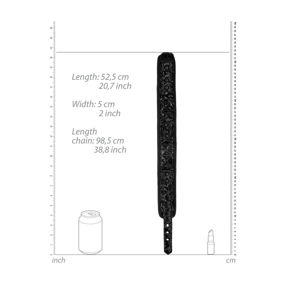 When total control is what you need, this sturdy yet comfortable collar with the attached leash ticks all the boxes! Designed with a diamond pattern, stylish neoprene, and faux-leather, five holes will give it sufficient adjustability to fit most. It has a length of 52.5 cm and a width of 5 cm. The robust black chain attaches with a lobster clasp to the secured O ring on the collar and combines with a comfortable handle.