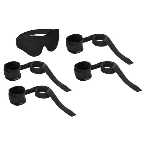 A hot and sexy beginners kit for essential one on one bondage fun. This erotic kit includes, four wrist and ankle restrains with 44 inch long connector straps, and one soft black blindfold. Ideal for that first step into erotic bondage and restraining sex. Bind them up and have fun.